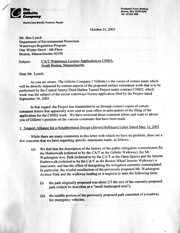 The Gillette Company has filed a letter with the Department of Environmental Protection (DEP) in response to public comment letters (including SAND’s) regarding the Central Artery / Fort Point Restoration C09D2 contract.