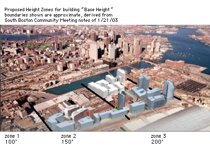 On March 1, 2004, at a community meeting held at the Tynan School in South Boston, the BRA publicly presented its conceptual buildout of undeveloped parcels along with each building height allowable under this plan (below). Heights shown here were hand-noted from the slide presentation and later overlaid on the existing conceptual plan.