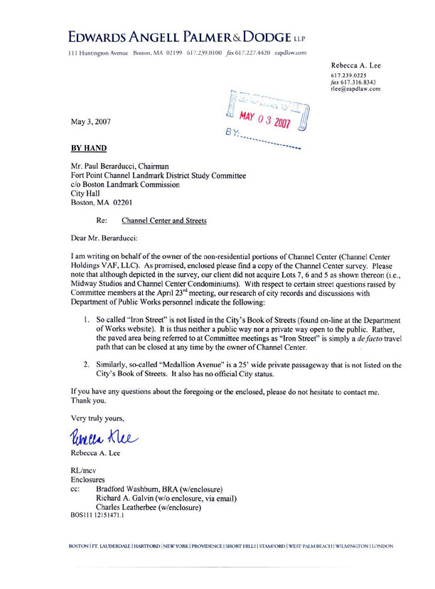 The following letter pertains to Iron Street and Medallion Avenue, streets in the Fort Point district that are privately owned, used for public vehicular traffic.